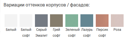Оттенки фасадов: Белый софт, Грей софт, Графит софт, Персик софт, Лазурь софт, Зелёный софт, Серый эмалит, Роза